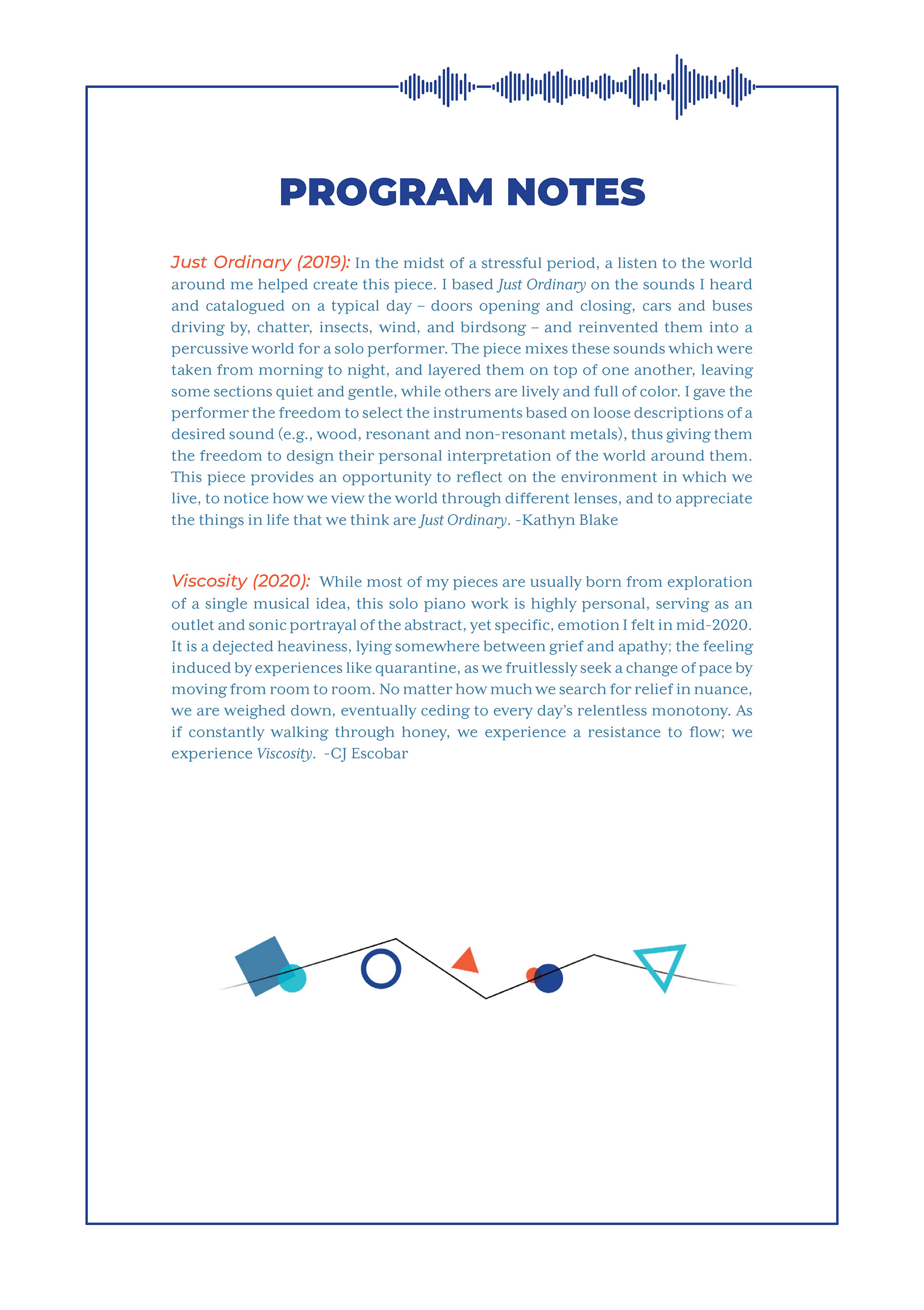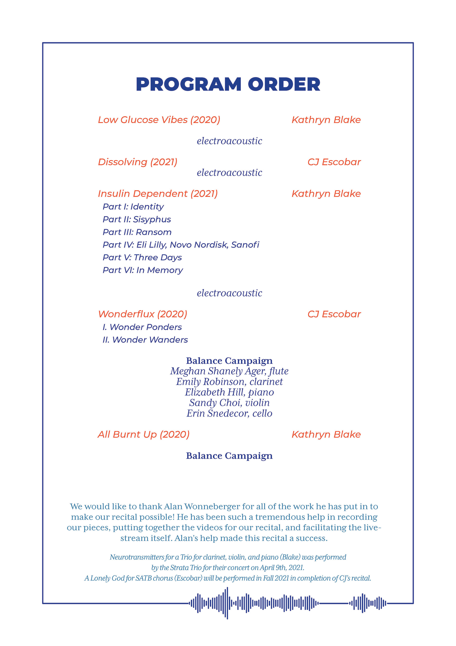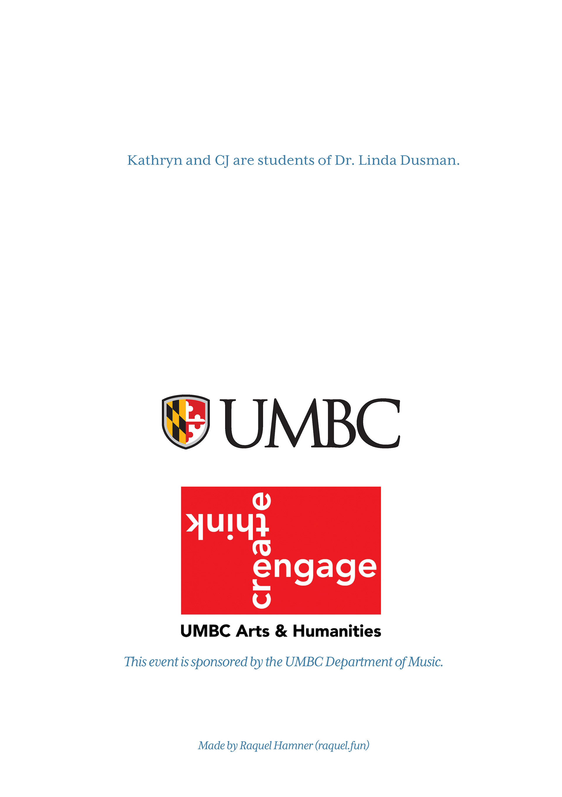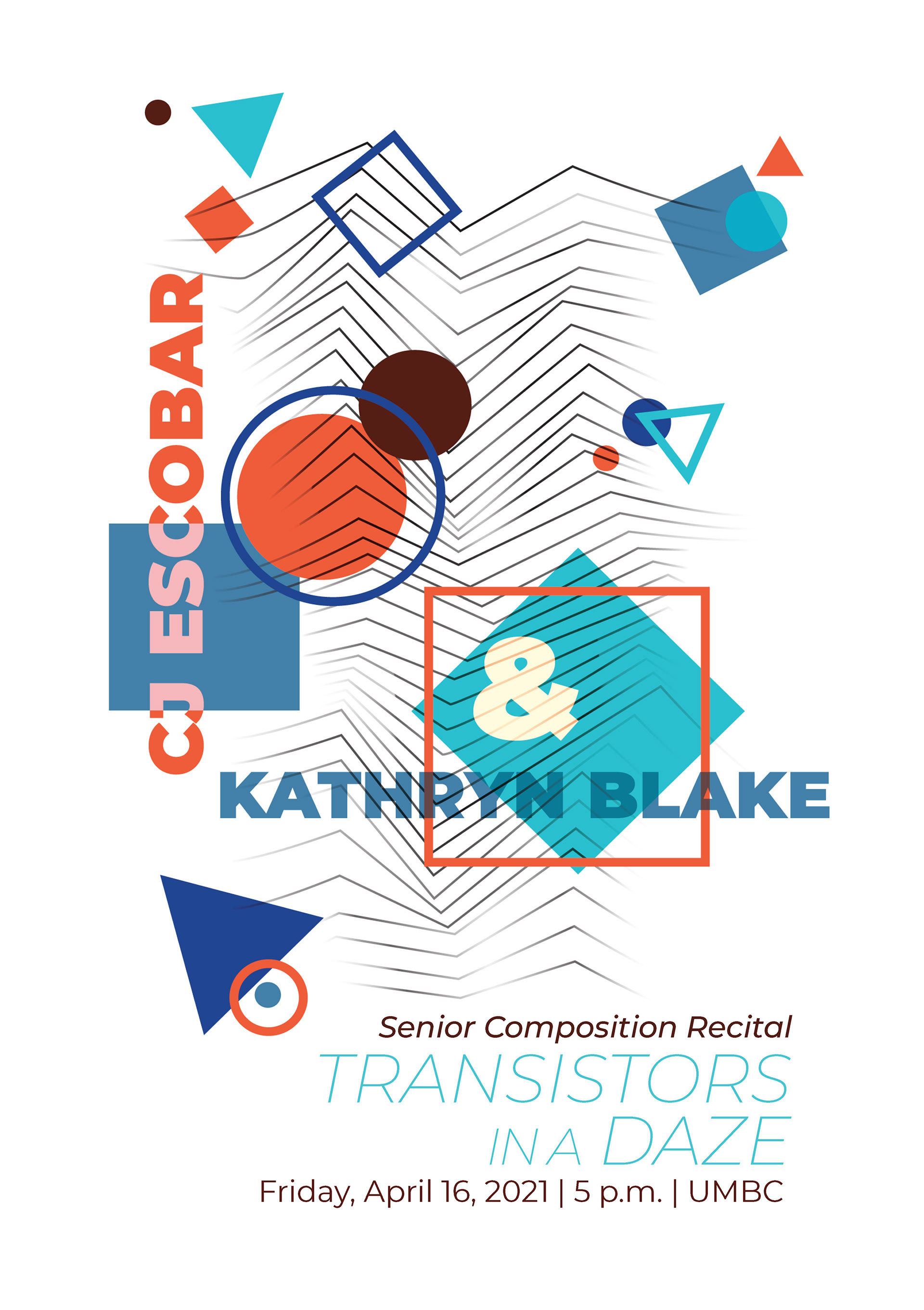 The program for Transistors in a Daze, a contemporary orchestra recital by CJ Escobar and Kathryn Blake at UMBC, April 16, 2021.