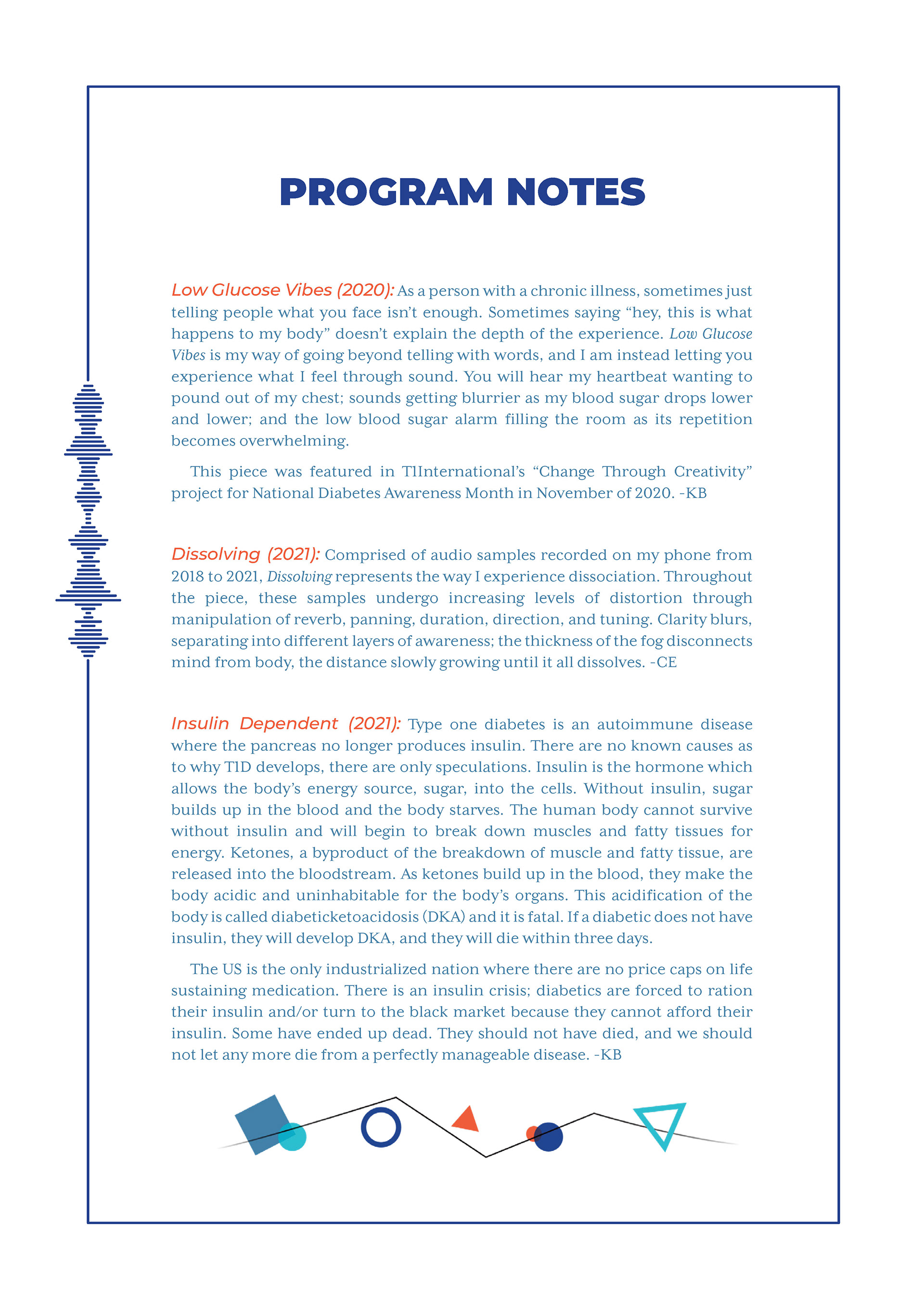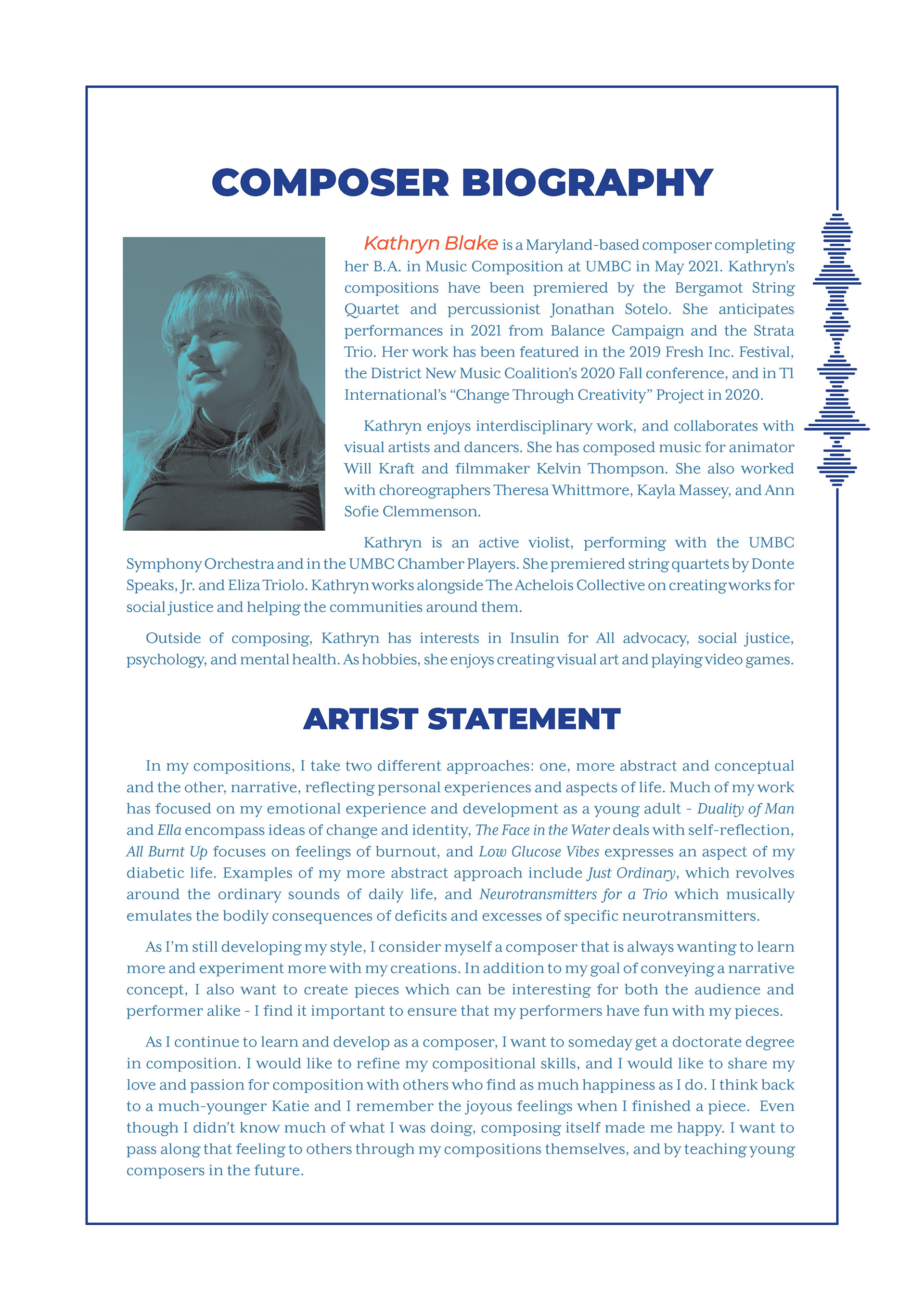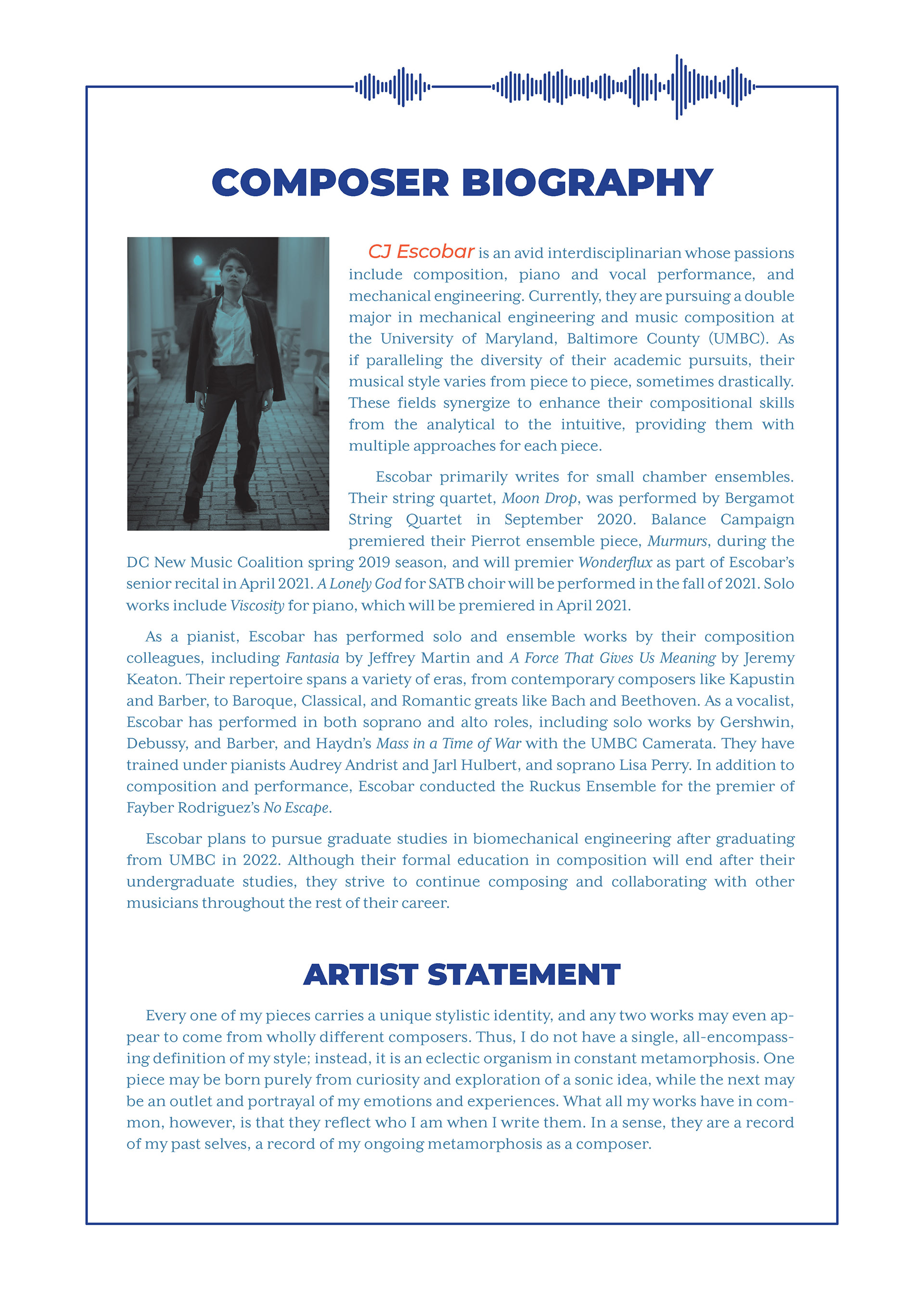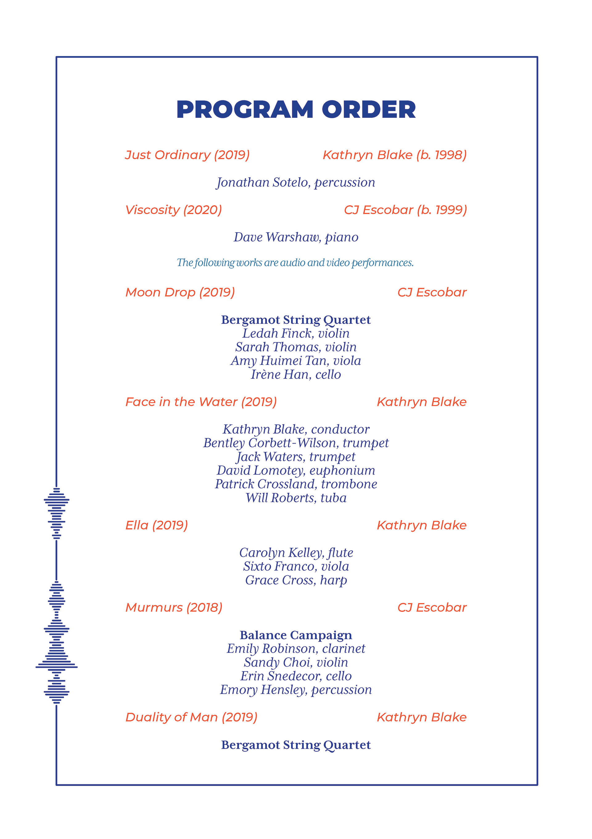 The program for Transistors in a Daze, a contemporary orchestra recital by CJ Escobar and Kathryn Blake at UMBC, April 16, 2021.